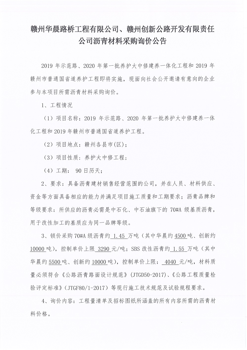 2019年示范路、2020年第一批養(yǎng)護(hù)大中修建養(yǎng)一體化工程和2019年贛州市普通國省道養(yǎng)護(hù)工程瀝青詢價文件