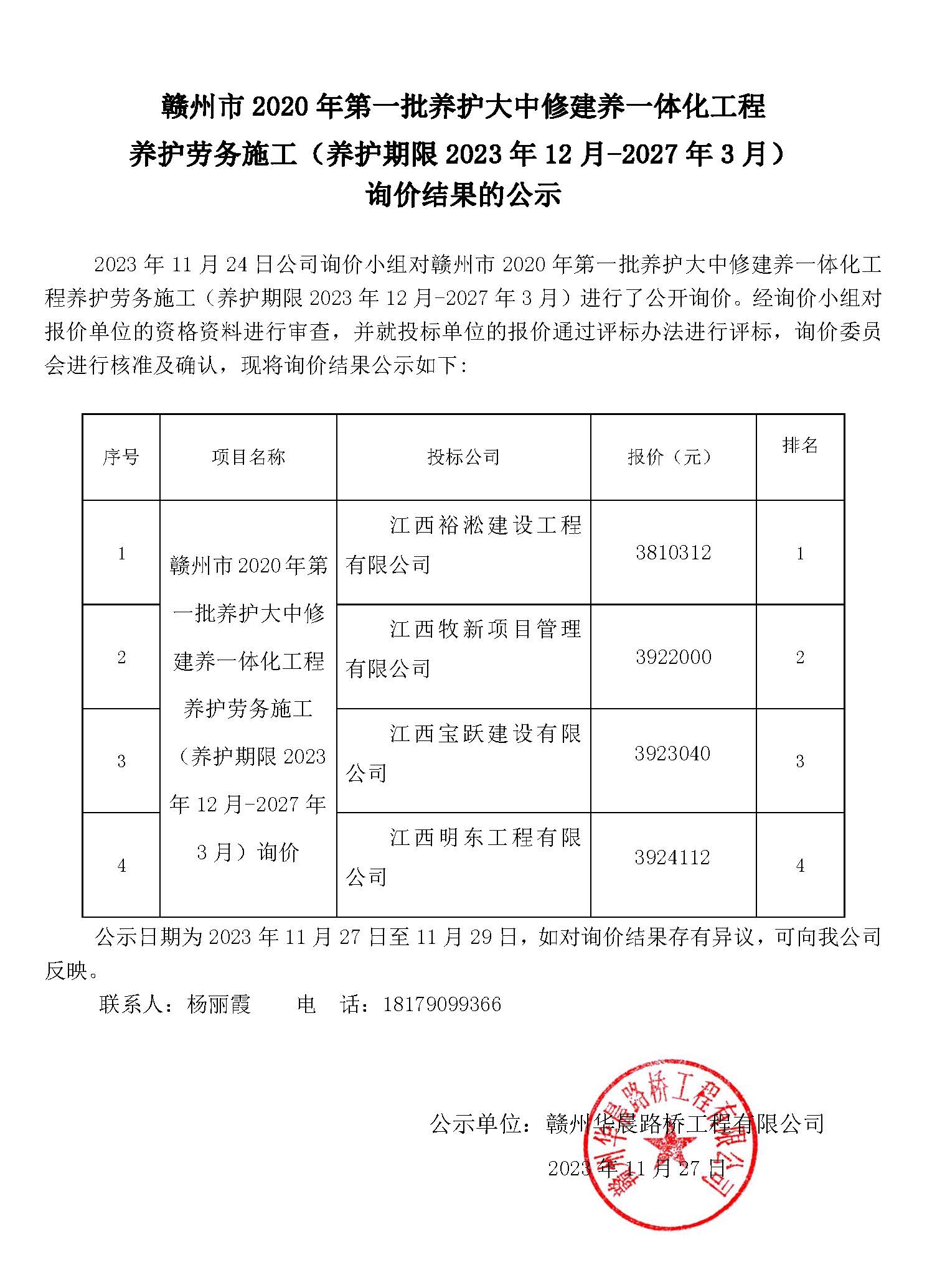 贛州市2020年第一批養(yǎng)護(hù)大中修建養(yǎng)一體化工程 養(yǎng)護(hù)勞務(wù)施工(養(yǎng)護(hù)期限2023年12月-2027年3月) 詢價(jià)結(jié)果的公示