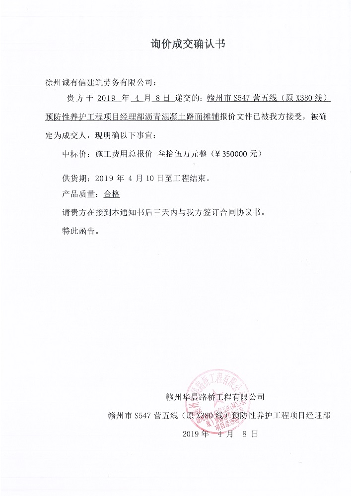 贛州市S547營五線(原X380線)預(yù)防性養(yǎng)護工程瀝青混凝土攤鋪詢價成交確認書