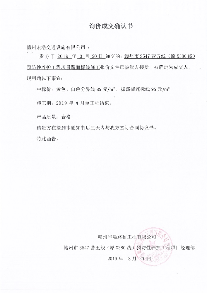 贛州市S547營(yíng)五線(原X380線)預(yù)防性養(yǎng)護(hù)工程項(xiàng)目路面標(biāo)線施工詢價(jià)成交確認(rèn)書(shū)