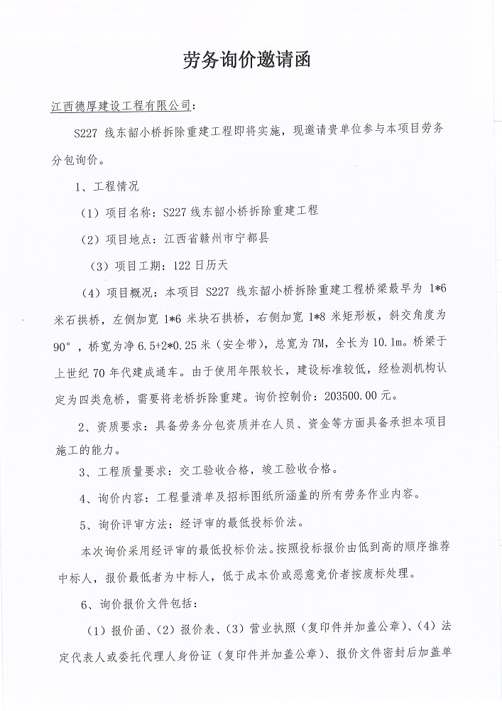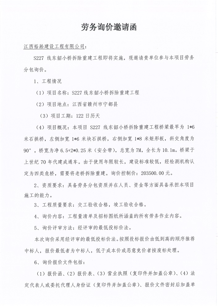 S227線東韶小橋拆除重建工程勞務(wù)詢價(jià)邀請(qǐng)函