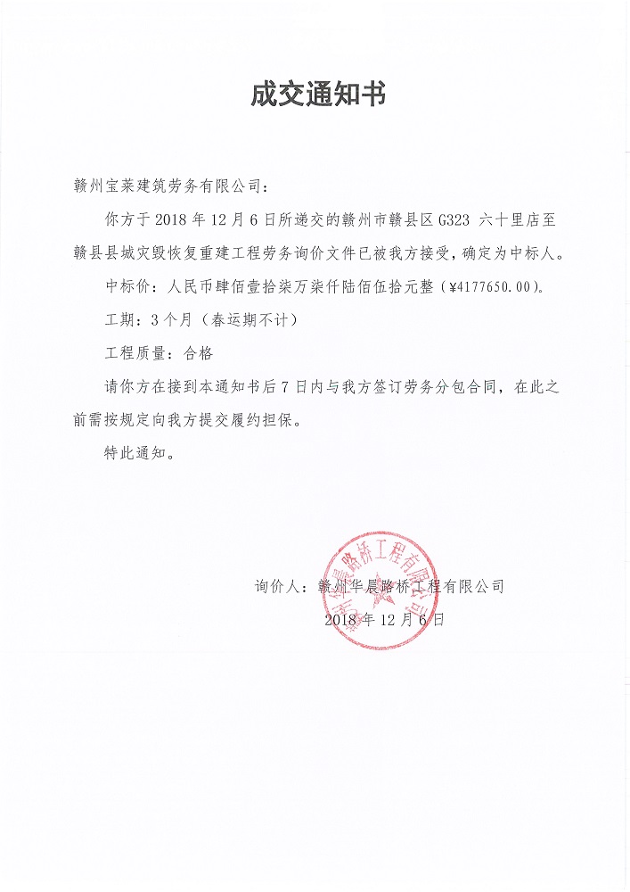 贛州市贛縣區(qū)G323 六十里店至贛縣縣城災(zāi)毀恢復(fù)重建工程勞務(wù)詢(xún)價(jià)成交確認(rèn)書(shū)