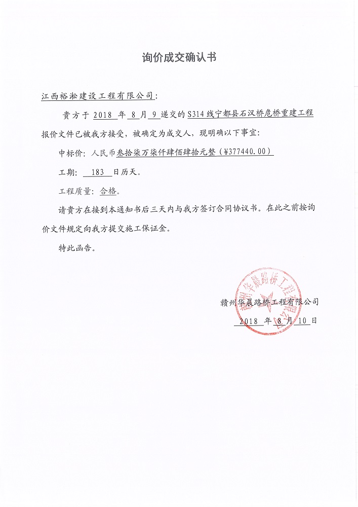 S314線寧都縣石漢橋危橋重建工程勞務(wù)詢價(jià)確認(rèn)書(shū)
