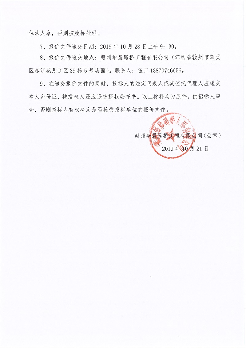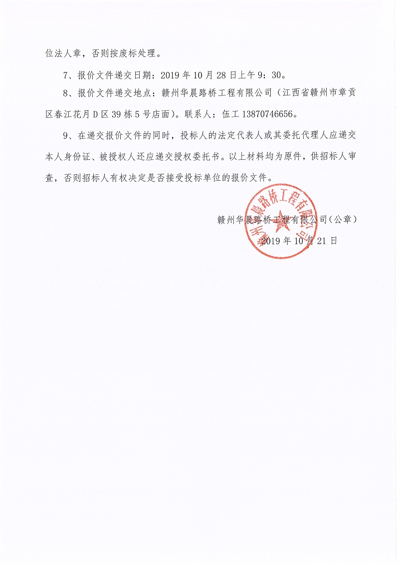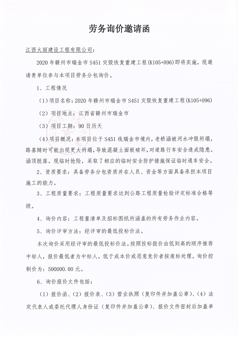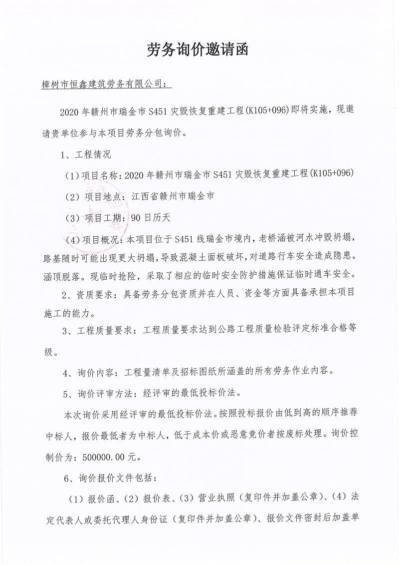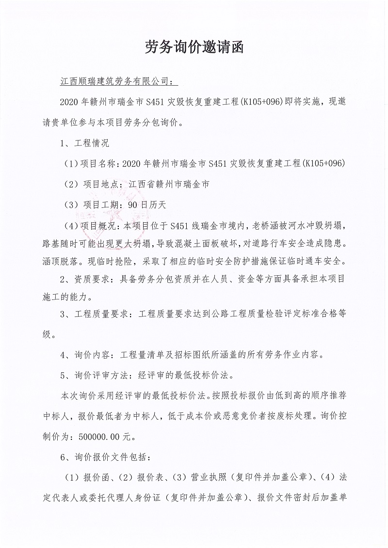 2020年贛州市瑞金市S451災毀恢復重建工程(K105+096)勞務詢價邀請函